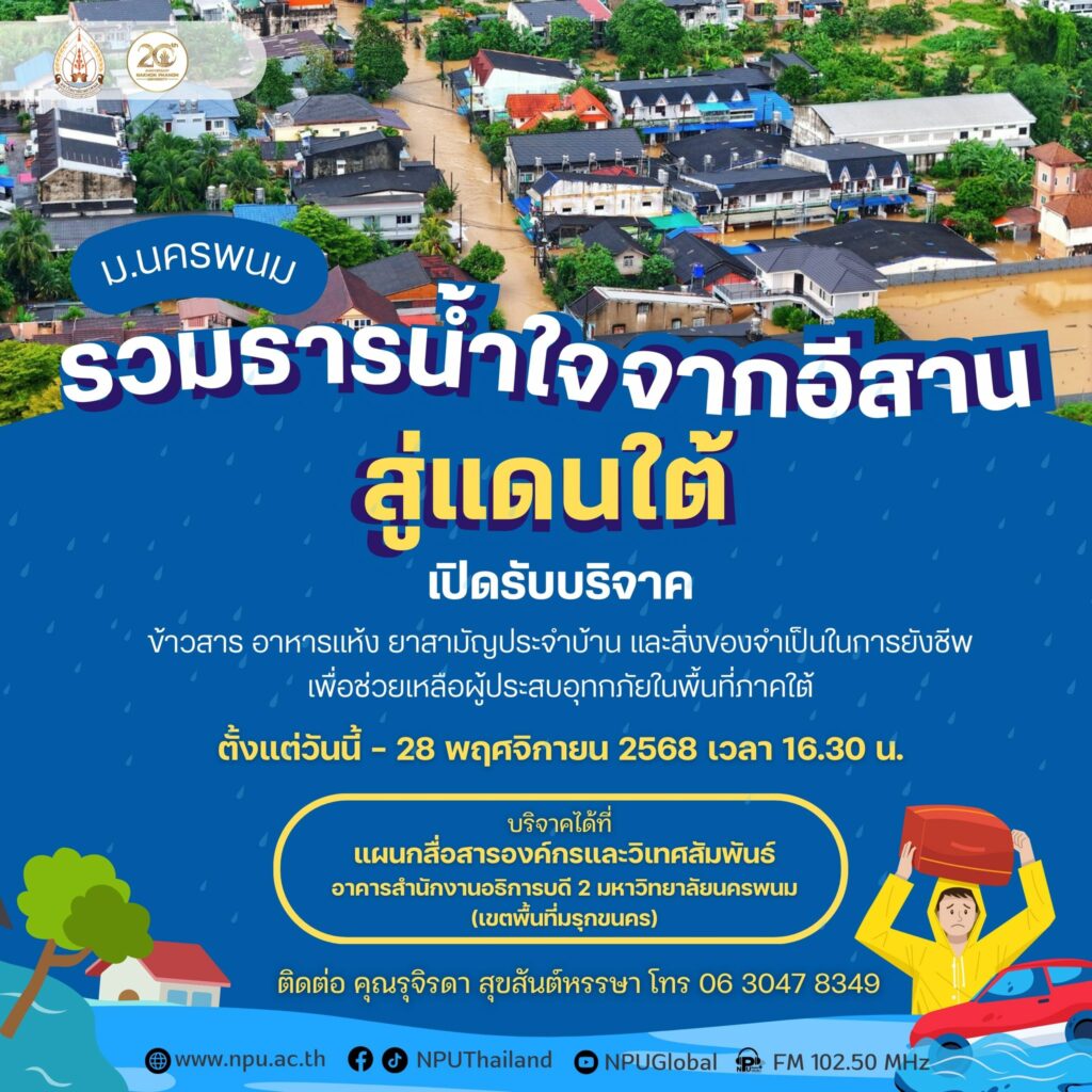 มหาวิทยาลัยนครพนม ขอเชิญร่วมบริจาค ข้าวสาร อาหารแห้ง ยาสามัญ และของใช้จำเป็น เพื่อช่วยเหลือผู้ประสบอุทกภัยในพื้นที่ภาคใต้ รับบริจาคถึงวันที่ 28 พฤศจิกายน 2568 เวลา 16.30 น. สถานที่รับบริจาค: แผนกสื่อสารองค์กรและวิเทศสัมพันธ์ อาคารสำนักงานอธิการบดี...